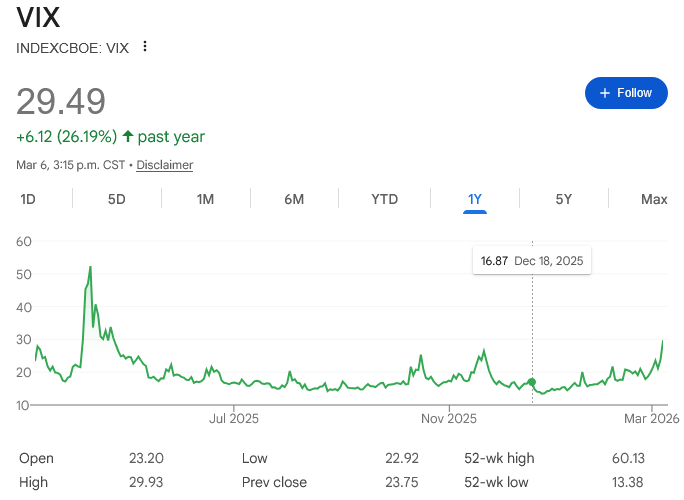 The VIX is ~30%, the highest it’s been since April of last year, when, you know, the Great Liberation Day event.