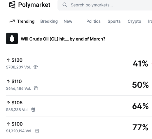 Here are Polymarket’s odds (as of March 7) for WTI’s price by the end of March.