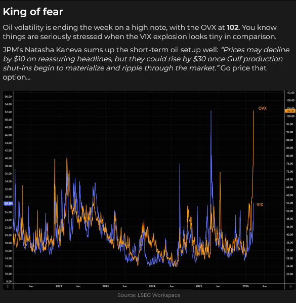 If the S&P trades lower again next week, I think there is a significant risk that “systematics” (CTAs and VOL control funds) will start selling, which may lead to broad market weakness, unless we hear that Trump has made a deal with Iran. (But: even if Trump says the war is over, the market has to believe that Iran won’t hit tankers in the Hormuz.)