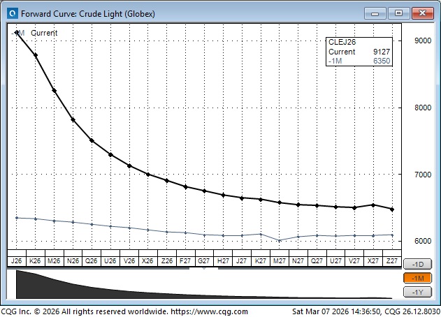 Here’s how the forward curve is priced: Friday’s close is the strong black line, and the other line is what the curve looked like a month ago. That is a “wild” steepening of the curve in response to the Iran conflict.