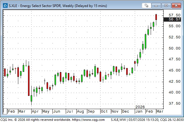 The XLE Energy Sector ETF has closed higher for the last 11 consecutive weeks, up ~30% since mid-December. The energy sector has been the strongest S&P sector YTD.