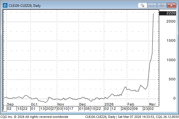 Here’s the April/December spread over the last 6 months. April and December were both trading ~$57 at the beginning of 2026; now, April is ~$22 premium to December. This dramatic steepening of the forward curve may be the market’s way of signalling that the current high risk premium in crude oil futures will be substantially reduced by year’s end.