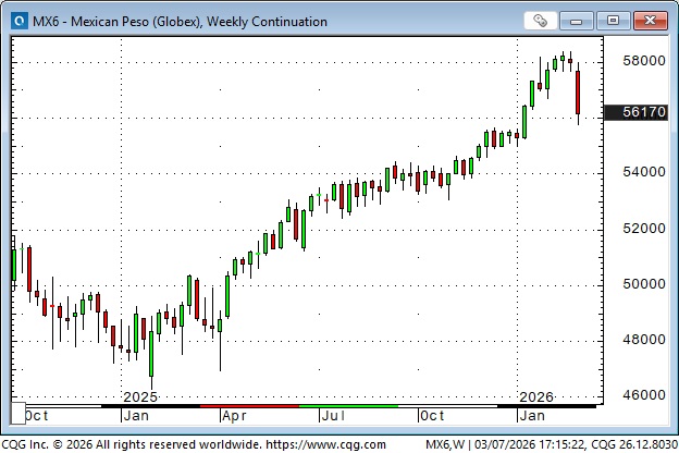 The Mexican and Brazilian currencies broke down early this week as the USD rallied. Those currencies had an extended run since early 2025 as carry trade “beneficiaries” (borrow Yen or Swiss francs at low rates, invest in Mexican or Brazilian high-yield s/t paper, and wear diamonds!), and complacency may have had a rude awakening this week.