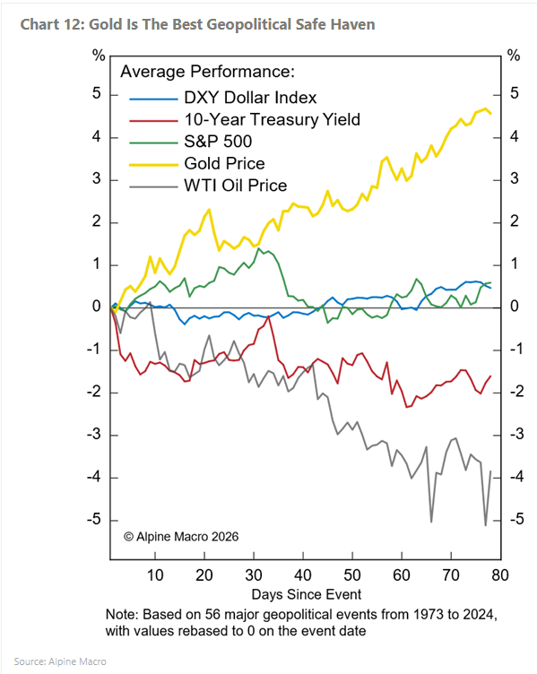 Historically, gold has performed well during periods of turmoil. An analysis of 56 major geopolitical events since 1973 shows gold consistently outperforming most other assets during times of global instability: