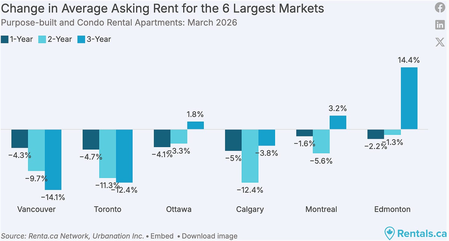 Over the past three years, rents are now down 14% in Vancouver, an unprecedented move.