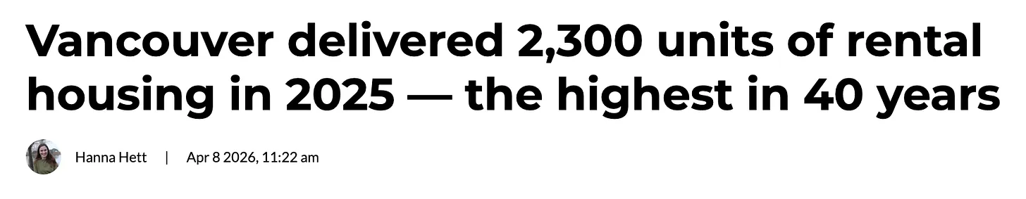 The city of Vancouver saw 2300 purpose-built rental units completed in 2025, the highest in four decades!
