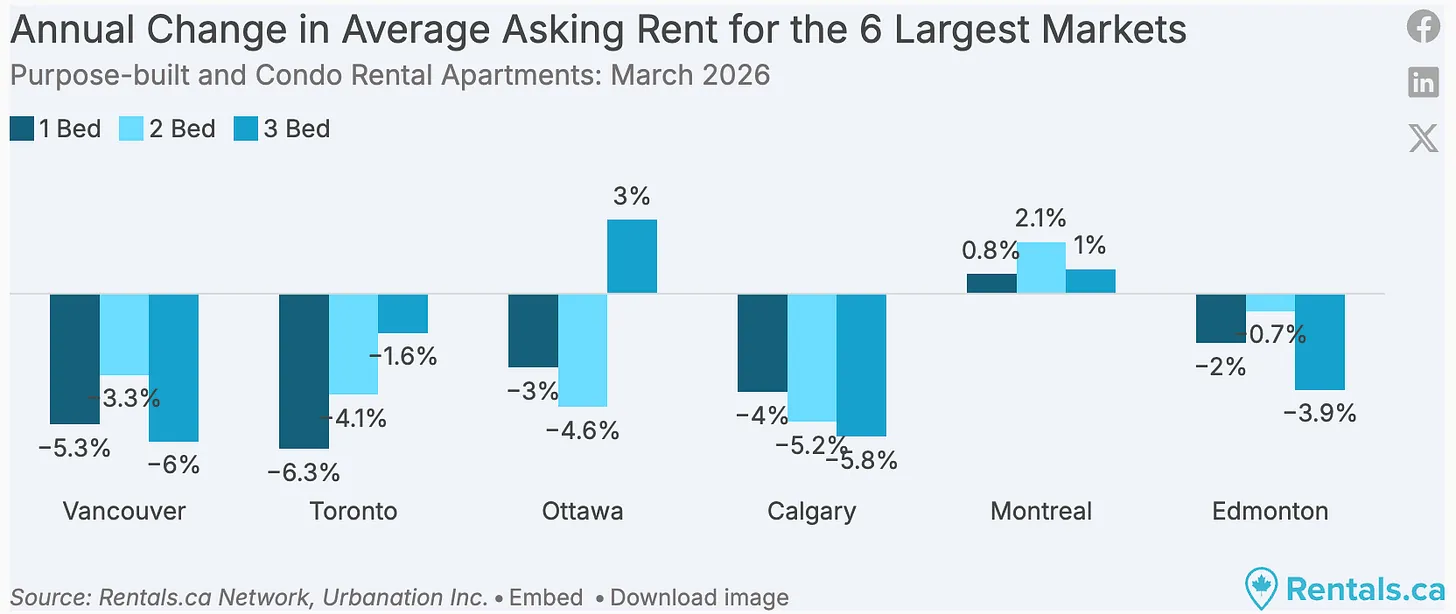 This is playing out across the country, not just in Vancouver. The average asking rent in Canada fell to a 35 month low in March, with rents now falling for 18 consecutive months.