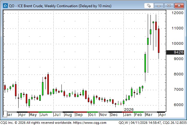 Front-month ICE Brent futures trades as low as $60 in January, soared ~100% to ~$120 in March, but have closed lower the past two weeks.