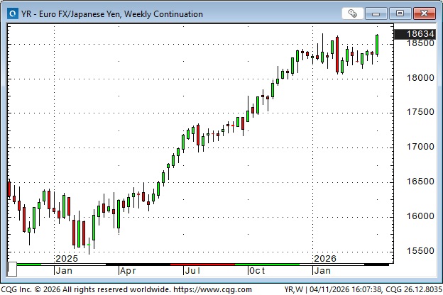The Euro has been much stronger than the Yen over the past two weeks, driving the Euro/Yen spread to a record high.