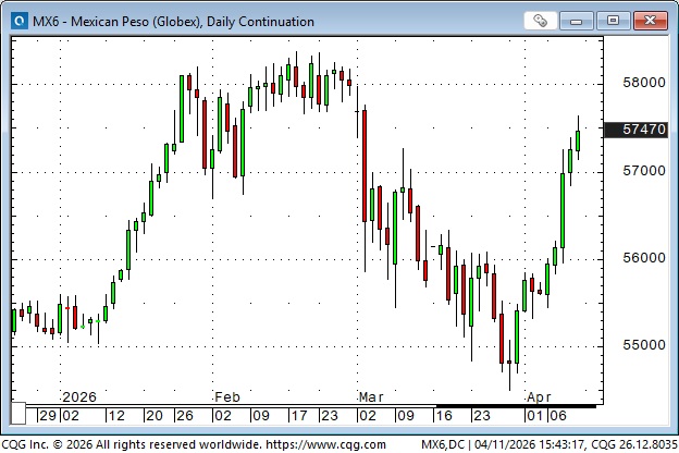 The Mexican Peso fell to 3-year lows in February 2025 on Trump’s tariff bluster, then rallied ~25% to February 2026 (think “carry trade” with Mexican short rates substantially higher than US rates). The Peso fell ~7% in March as the Iran war raged, but reversed sharply from the end of March as cross-market sentiment swung to a possible de-escalation.