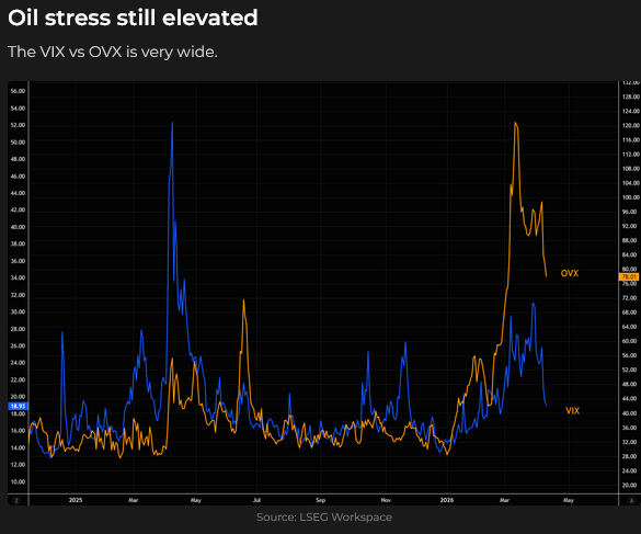 Oil volatility has fallen, as VOL has dropped across assets, but still remains historically high.