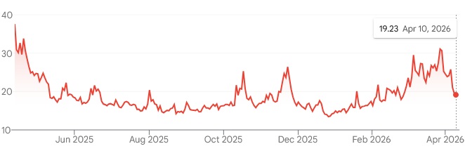 Volatility across markets has dropped sharply. The Vix hit 31% in late March, but ended the week ~19%.