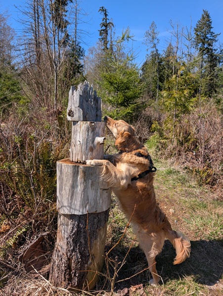 Barney and I are enjoying the warmer spring weather as we walk the forest trails. One of the places we like to go has lots of mountain bike trails that are often “signed” by their creators. Here’s Barney checking out a trail sign.