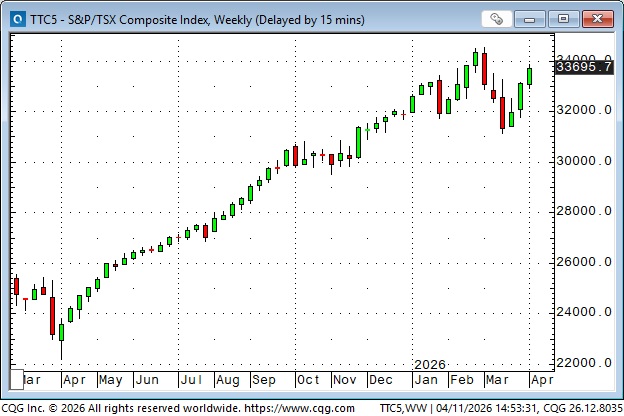 The Toronto index reached record highs on the first day of the Iran war, sold off for three weeks, then turned higher before the S&P, and has closed green for the past three weeks.