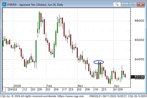 The Japanese Yen traded lower in early March as most currencies fell agains the USD, but fears of intervention restrained the fall. The Yen rallied briefly mid-month on PM Takaichi’s visit to the White House, (blue ellipse) but fell back again into monthend. Over the last two weeks the Yen has been the weakest of the G10 currencies against the USD.