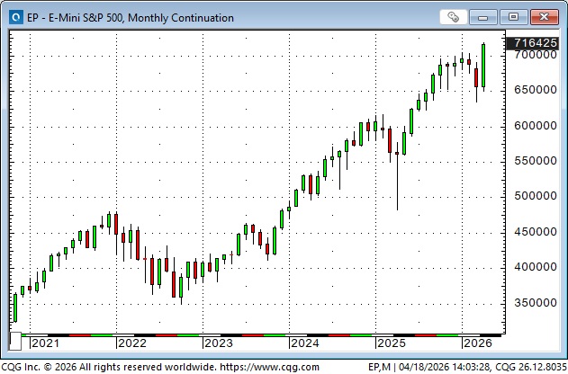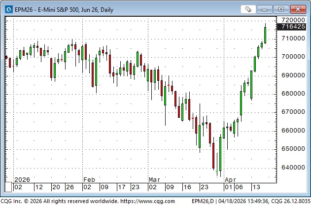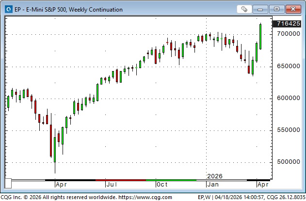 S&P futures closed green for 14 of the past 15 trading days, rising ~13% to new all-time highs. Half of those gains came this week. The market gapped down 100 points on Sunday afternoon following “no agreement” at the Islamabad peace talks, but then soared for the rest of the week as “good news” kept coming every day, with Trump proclaiming on Friday that the Hormuz will be open forever! That sounded a bit like a bell ringing.