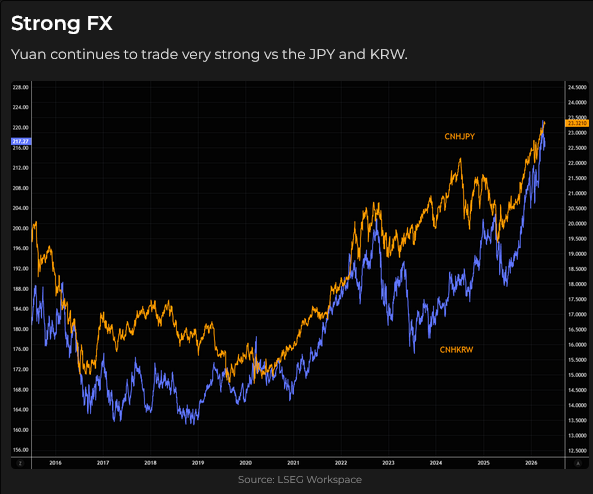 The Chinese RMB (with a soft peg to the USD) has been rising against the Japanese Yen (gold line) and the Korean Won (blue line) since 2020, and is now at multi-year highs (as the USD is now near multi-year highs against the Yen and the Won).