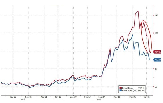 Dated Brent (that’s physical oil for delivery in the North Sea at a specific date) briefly traded above $140 in early March but dropped below $100 this week.