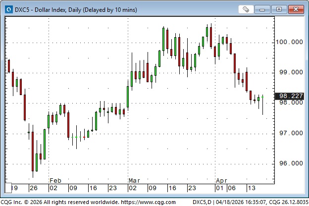 The DXY US Dollar Index rallied in March as the Iran war escalated, and then trended lower in April as traders began to anticipate an end to the war. In other words, the USDX moved inversely to the equity markets, but with much less velocity. The USDX traded on Friday at the same levels as before the war began.