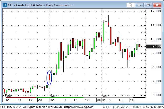 WTI futures prices gapped higher on March 2 (blue ellipse), but then fell back to close near the lows of the day, another sign that the market was expecting a brief conflict.