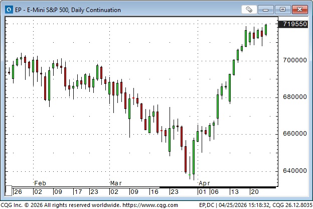 S&P futures fell ~10% from January’s record highs to March lows. The market turned higher on March 31 and is up ~13.5% at Friday’s close, a new record high.