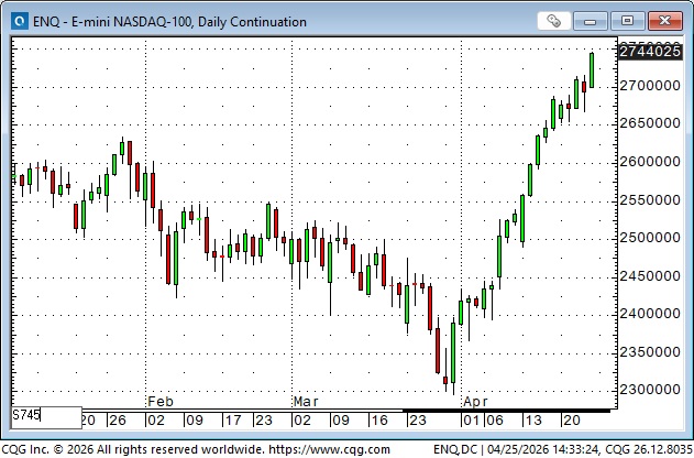 Nasdaq futures fell ~13% to March lows and rallied back ~15% to Friday’s close, a new record high.