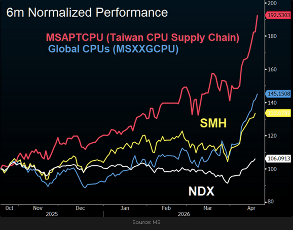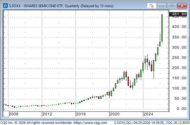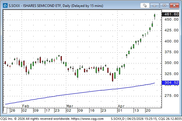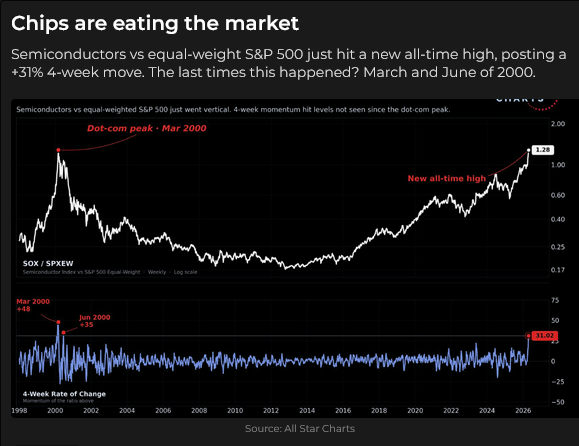 Semiconductors Vs. equal-weight S&P are at a record high.