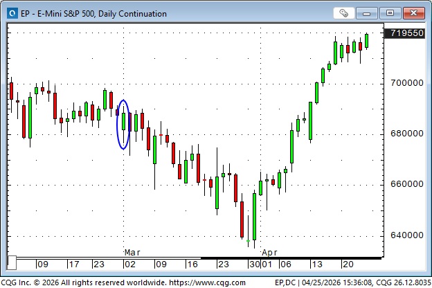 On March 2 (blue ellipse), the first trading day after the US and Israel attacked Iran, stocks gapped down from the previous Friday, but then rallied to close above Friday’s close. It looked like the market expected the fighting would be over in a few days, just like it was in June 2025.