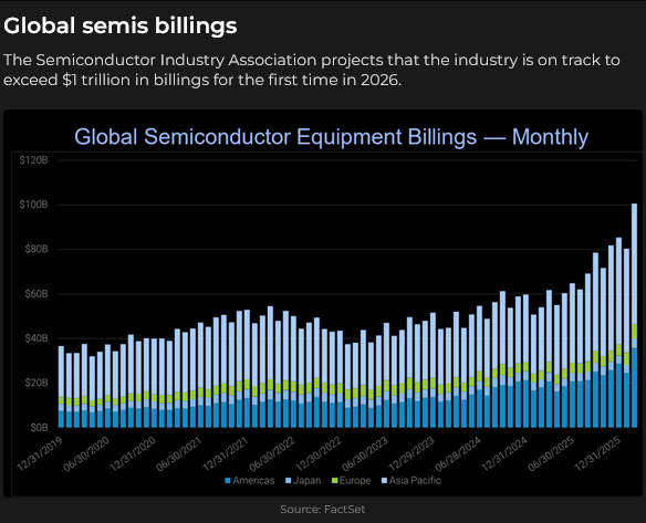 Global Semis billings have surged (Peter Boockvar suggests people may have been buying more than they needed “in case” of a future shortage due to the Iran war).