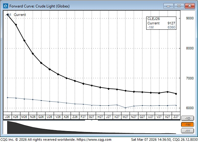 Another sign that the market expected the fighting to end quickly was that nearby WTI futures rose sharply, while deferred contracts rose only slightly. In the March 7 Trading Desk Notes, I wrote: