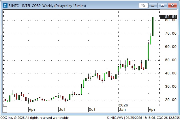 Intel rallied to record highs this week (topping the 2000 highs), up 4X from year-ago levels, up over 100% from the March lows.