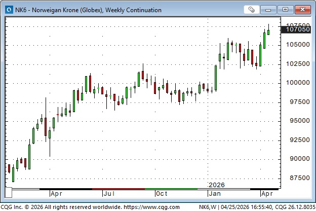 The strongest currency in April looks to be the Norwegian Krone. Norway produces nearly 2 mbd and exports ~70% of that to other European countries. This chart is the NOK-to-USD rate.